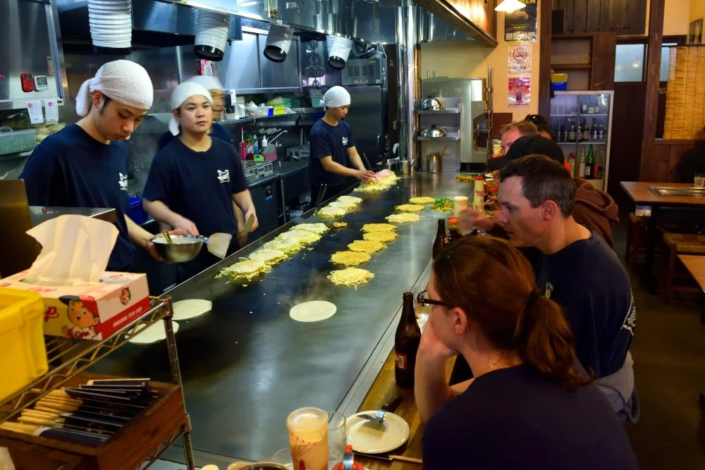 After the park, we headed back into the hustle and bustle of the city to find a spot for a local favorite, okonomiyaki. We tried a place called Nagataya, which had good stars, and it did not disappoint. Hiroshima style okonomiyaki is a dish where you use a thin batter on a griddle and pile lots of cabbage, pork, yakisoba (noodles), a thinly fried egg, and whatever else you want on it. You then flip it and let the ingredients steam themselves while you put sauce, seaweed and whatever other toppings you want on it. Once the entire dish is finished it’s a steamy pile of sweet and savory deliciousness. I highly recommend it.