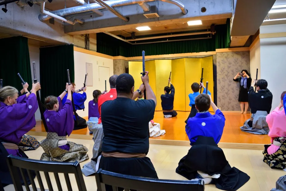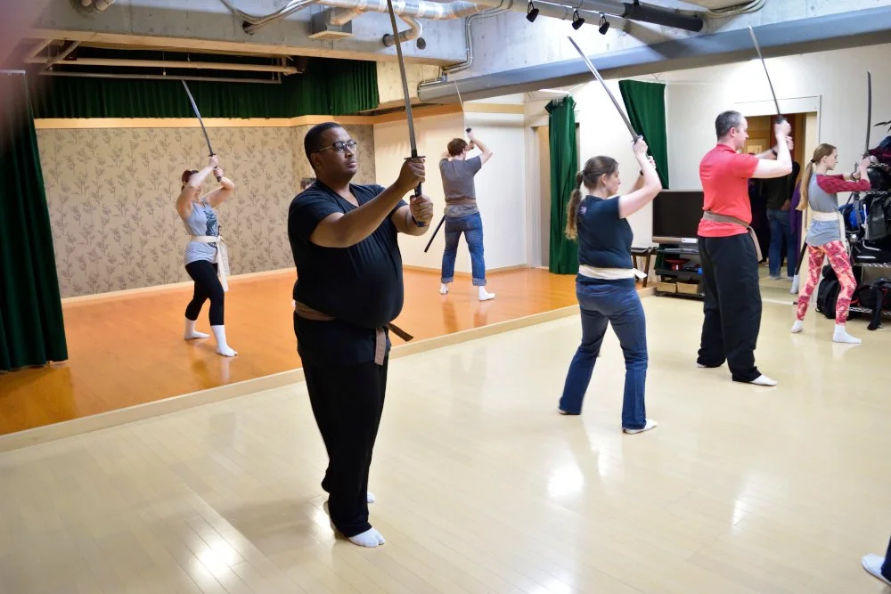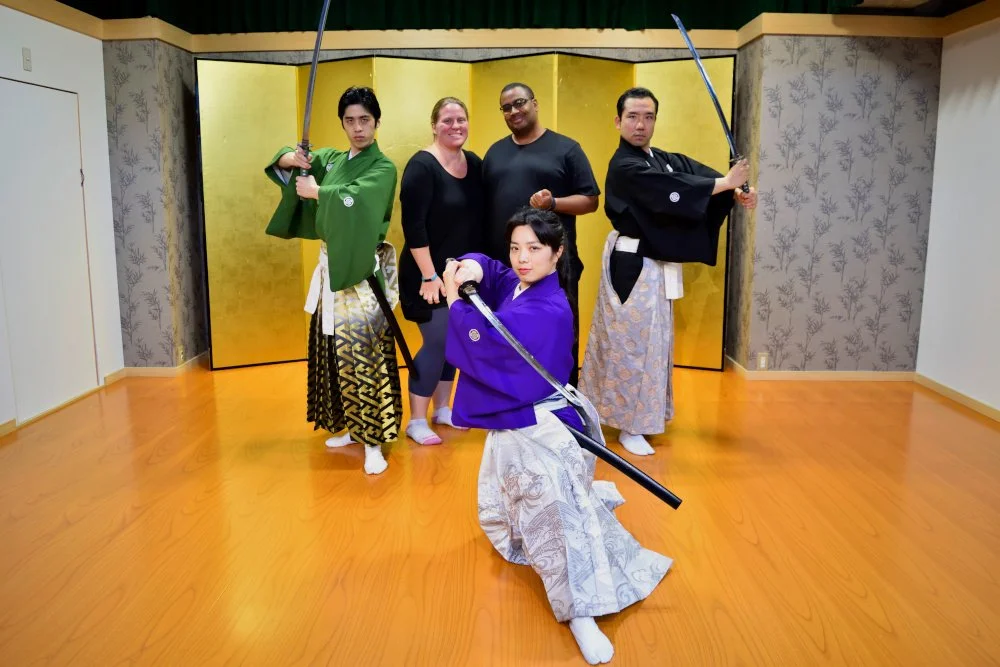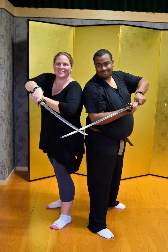 The next day we hit the road and headed to east to Kyoto. We visited the Samurai Kenbu Theater. Kenbu is a traditional Japanese stage performance utilizing the katana (the traditional Japanese sword), and this location offers professional performances. We visited earlier in the morning though to actually participate in a class to learn a simple kenbu, and then perform it. Anne didn’t want to play so much, but Tim did the training under Master Ryu, and eventually performed his short dance. After class we were treated to an hour of professional demonstrations from Ryu and the other masters.