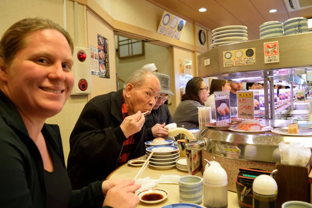 After class, we were starving, so we headed to Sushi no Musashi, a really good conveyor belt sushi by the plate joint. There’s something to be said about the interactive nature of the experience as plates of delicious maki, nigiri and sashimi roll by and you have to make a split second decision on whether or not you want to try that tasty morsel before it’s too late and on to the next guest. We caught a few locals' eyes popping as we tried everything on the belt and then some, and our plates started towering. We didn't care though, it was so good.